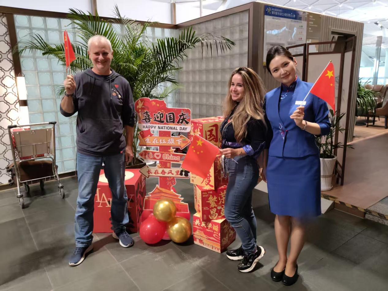 10月1日,在咸阳国际机场T5航站楼东航V20贵宾厅,东航西北分公司两舱休息室服务人员与外籍旅客一起共庆佳节。