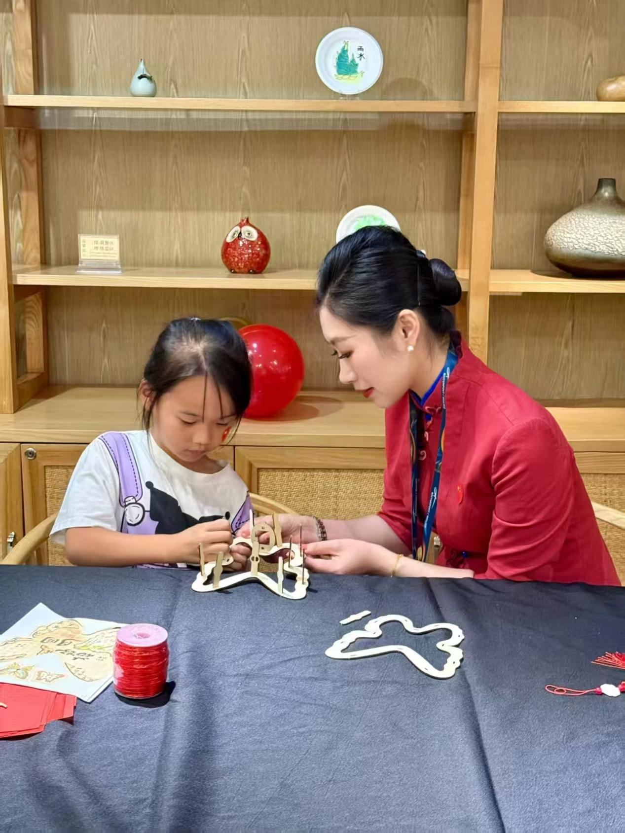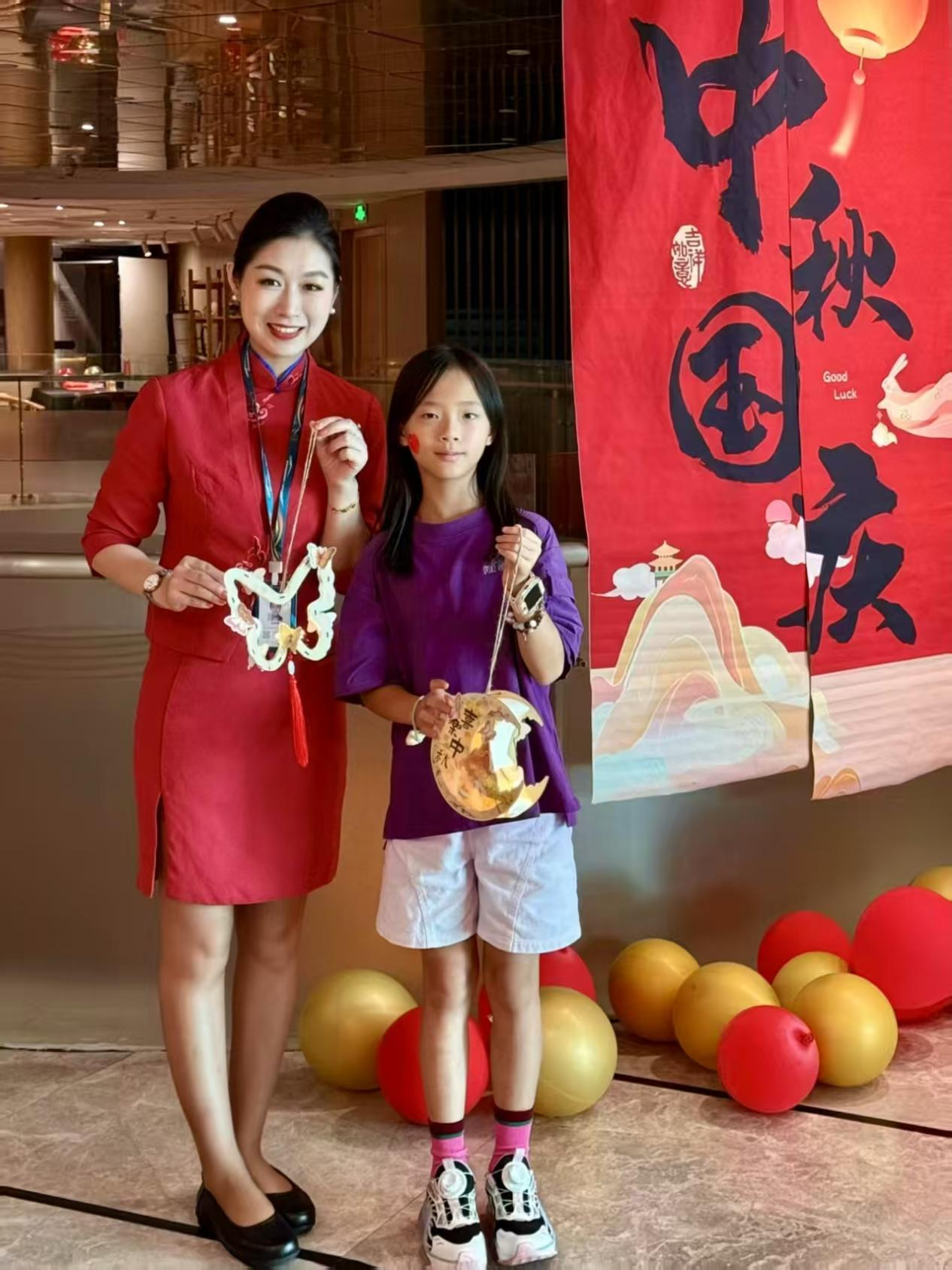 国庆佳节,东航广东分公司在广州白云机场的贵宾室推出特色餐食,搭配独具岭南风情的特调佳饮,诚邀八方旅客共品甜蜜滋味,传递家国同庆的温馨祝福。在亲子互动区,东航工作人员与小朋友们共同制作“玉兔探月”等灯笼,欢声笑语此起彼伏,双节氛围浓厚。